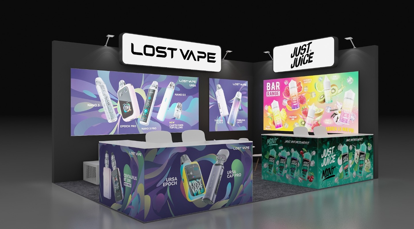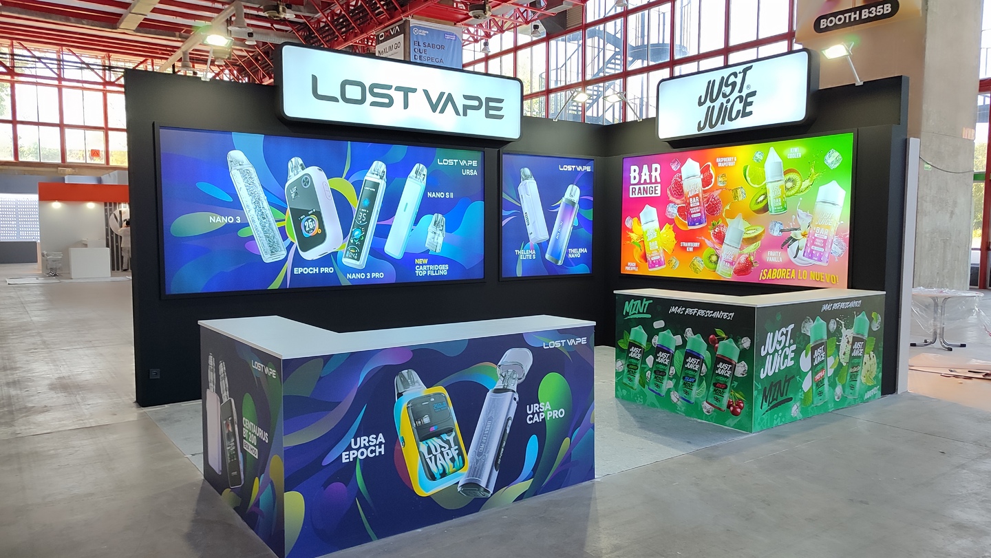 At Vapexpo Madrid, Just Juice (UK) and Lost Vape (China) required a shared exhibition booth that maintained distinct brand identities while presenting a cohesive visual experience.